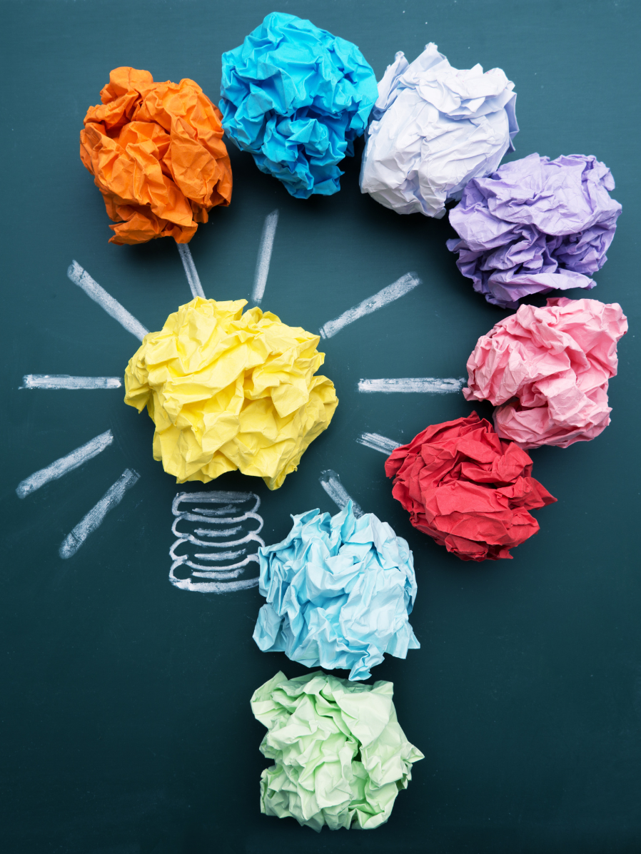 Crumpled pieces of rainbow tissue paper form the shape of a question mark.